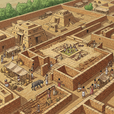A reconstructed glimpse of everyday life inside a Harappan city, complete with organized streets, bustling markets, and the advanced urban planning that made the Indus Valley Civilization stand out. |