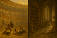 As Rome grew larger, its inhabitants shifted their attention from value-oriented action to the way of consumption. Newer gladiator games, new exotic luxuries, and new festivals overtook anyone’s responsibility to serve their community or produce communal rationality. The Roman legacy of robust intellectual activity – the argument and debate, the study of philosophy, or even the craft of the state- all diminished. At the same time, social bread and circuses allowed the masses to be distracted from the growing impotence of civic thought and an increasing loss of moral consensus.